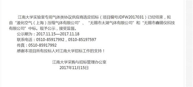 江南大學實驗室專用氣體類協(xié)議供應商選定招標(項目編號:JDFW2017031)已結束,熱烈慶祝鑫錫儀中標成為江南大學氣體供應商!